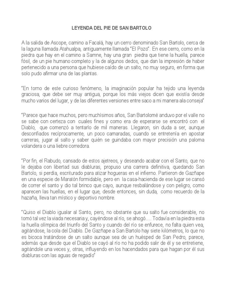 The definitive source about decks players and teams in Clash Royale. Nada mejor que escuchar. EL PIE DE SAN BARTOLO Cuenta la Leyenda que un ser codicioso le propuso a un hombre llamado San Bartolo a ser una carrera por las tierras del valle Chicama y nuestro querido Ascope este no es nada más ni nada menos que el mismo diablo este ser despiadado y obstinado con grandes cuernos y una gran cola que quiso apoderarse de las tierras del pueblo y que para su mala.